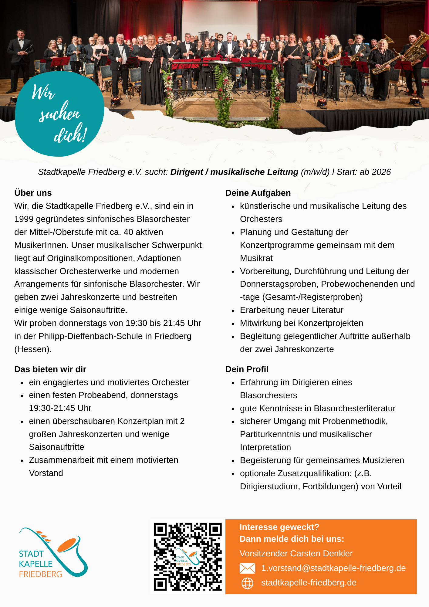 Die Stadtkapelle Friedberg e.V. sucht ab 2026 eine neue musikalische Leitung / Dirigentin / Dirigenten (m/w/d)!